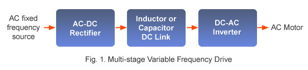 However the most commonly used VFDs are multi-stage converters. In these drives the input energy from a fixed frequency AC source (the AC mains power supply) is converted to a DC form by means of a rectifier and stored in a energy storage element in the drive. The variable voltage (or current), variable frequency output is generated from this energy reservoir. Thus there is a multi-stage AC-DC-AC conversion process. The following diagram illustrates the multi-stage energy conversion process.